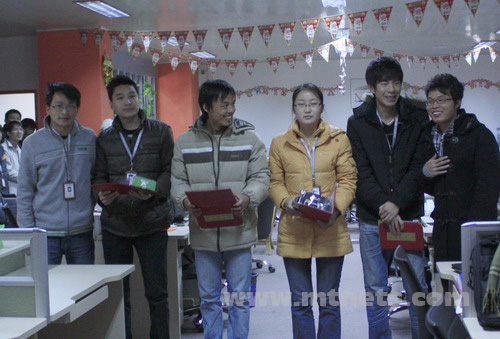 市场部曹林、周利松、潘俊海分别获得11月个人销售业绩前三名,新进员工为获奖者颁奖。意气风发的市场精英