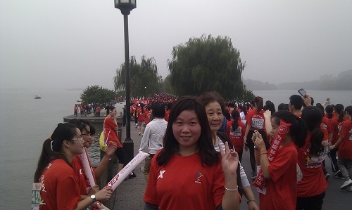 汪露:其实我参加的原因很简单,因为没见过这么浩大的场面,觉得人生很难再遇一次,就觉得应该要去见见,人生苦短,趁年轻,趁活着,趁还有那个心情。跑后算是见到的,人山人海,还几乎都是清一色服装,放眼望去,一堆红色在逛西湖。