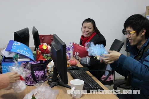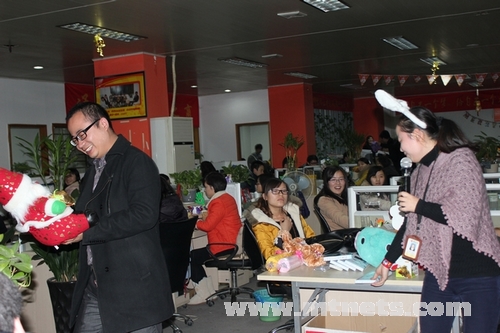 第二波活动是平安夜每个必威中文官网首页都受到了一个精美包装的苹果,公司祝大家来年平平安安,圆圆满满。圣诞节当天圣诞老人和兔女郎们闪亮登场,为大家表演了明通版的《江南STYLE》,并为大家派发了袜子,毛绒玩具等各种小礼物。