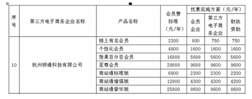市政府3000万/年的专项资金开展电子商务进企业项目,杭州市经委委托了14家第三方电子商务平台进行申报工作,明通科技就是14家之一,负责通知企业进行申报,协助企业开展电子商务应用。 享受杭州明通科技以下服务可获得政府资金支持: