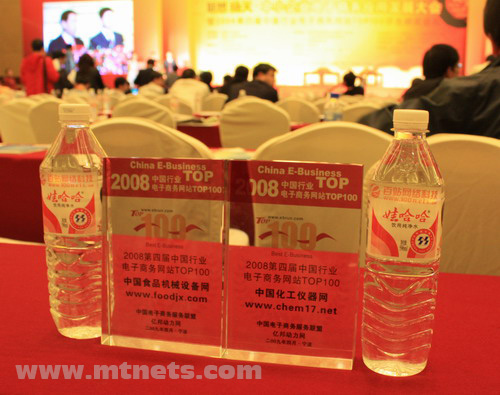 2009年4月17日-18日,“中小企业电子商务应用发展大会暨2008第四届中国行业电子商务网站TOP100评选颁奖盛典”在“行业网站总部基地”——浙江宁波隆重举行。17日下午,激动人心的电子商务网站TOP100评选颁奖更是掀起此次千人盛典的高潮,明通旗下两大实力网站,中国化工仪器网www.chem17.com和中国食品机械设备网www.foodjx.com均获得“中国行业电子商务网站TOP100”荣誉。