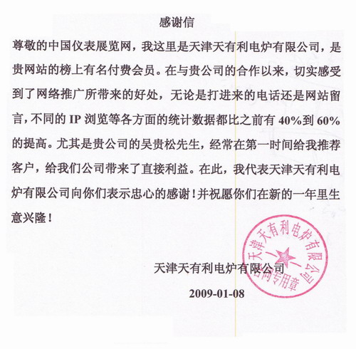 低成本、高回报、范围广、速度快,网络营销的种种优势早已深入天津天有利电炉有限公司销售理念之中,公司充分利用网络平台展示产品、推广产品,树立企业品牌形象。通过中国仪表展览网的专业平台,天有利持续4年享受榜上有名会员服务,掌握了网络推广的技巧,大大提高了公司网站的访问量和各项排名,在电炉市场中获得了可观的客户资源。电子商务的方便快捷为天有利带来了直接的利益,网络推广势在必行,选择正确的平台,效果直接可见。