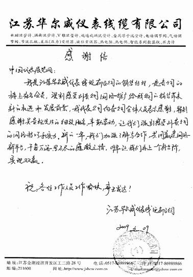 江苏华尔威仪表线缆有限公司08年在网络推广方面取得了斐然的成绩,网络推广给公司的销售带来新的机遇和发展前景。公司在网络推广中的突出表现得益于中国仪表展览网的大力支持和周到服务,特致信对中国仪表展览网的技术实力和行业实力表示了充分的肯定,对相关工作人员予以衷心的感谢,并对09年的合作和前景充满了信心。