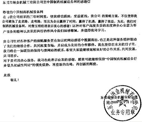 在与贵公司结识的三年时间里,使我感受颇深,受益匪浅。贵公司的策划方案,不仅使的我公司避免了走老路、走弯路,而且为企业赢得了时间,赢得了机遇,赢得了效益。为此,我们对制药机械设备网,对詹玉明经理表示衷心的感谢!这种对客户高度负责的态度和全心全意为客户服务的精神以及雷厉风行的作风令我们深感敬佩,并值得我司学习。