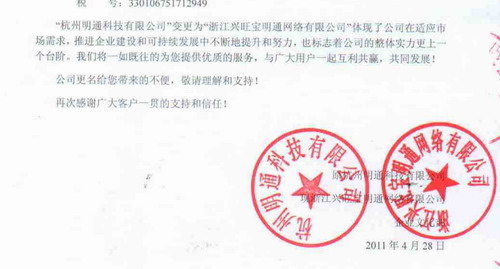 本司企业原经营范围、公司地址、工作人员、联系电话、服务项目和内容均不变。2011年4月29日前用原“杭州明通科技有限公司”名称所签订的业务合同仍然有效。