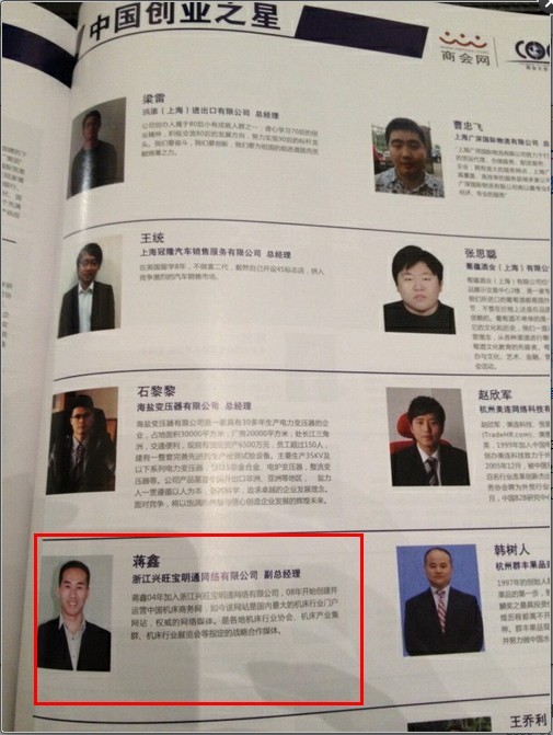2012年5月24日,未来商业领袖领导能力论坛暨中国创业之星颁奖典礼在杭州洲际酒店隆重举行。经2012年商会大会组委会评选委员会严格审定,BetWay体育通旗下网站中国机床商务网站长蒋鑫荣获“中国80后优秀创业之星”称号,并授予荣誉奖杯。