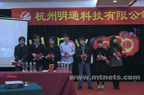 明通旗下二十多个网站团队欢聚一堂,对09年的目标任务立下军令状,豪情满天。颁奖典礼环节更是盛况空前,公司评选出了最佳员工奖、最佳主管奖、最佳团队奖和杰出贡献奖四大奖项,对过去一年在明通公司努力付出和表现优秀的员工和团队寄予感谢和表彰。音乐响起,在主持人的邀请下获奖者登上颁奖舞台,领取属于他们的荣誉和奖励,荣誉视频播放着他们忙碌的身影,令人感动的事迹,台上台下所有人热烈的掌声掀起激昂澎湃的浪潮。